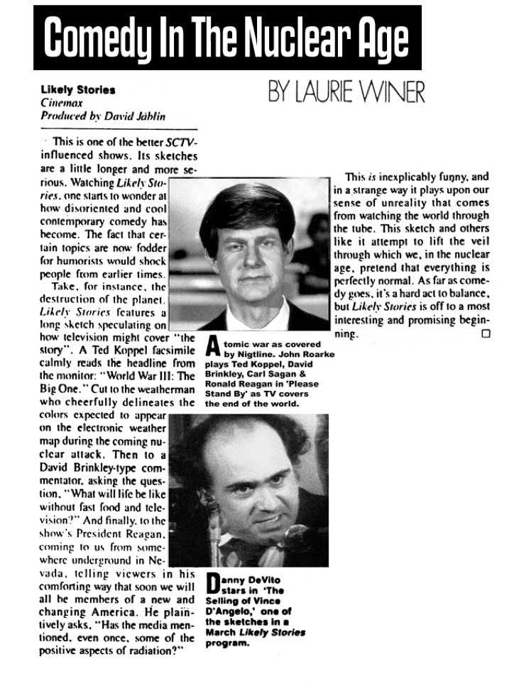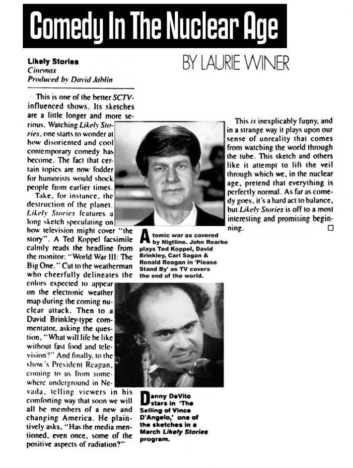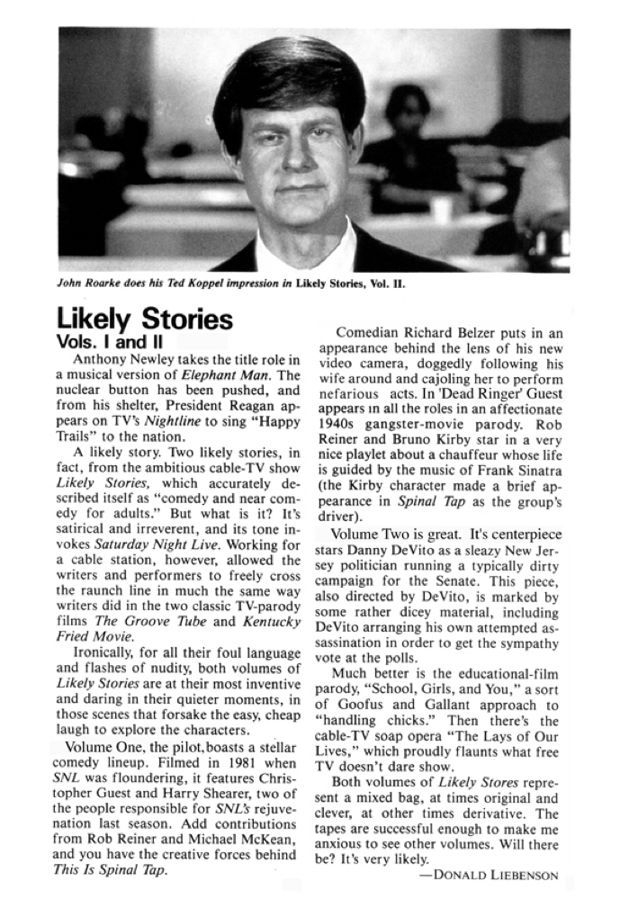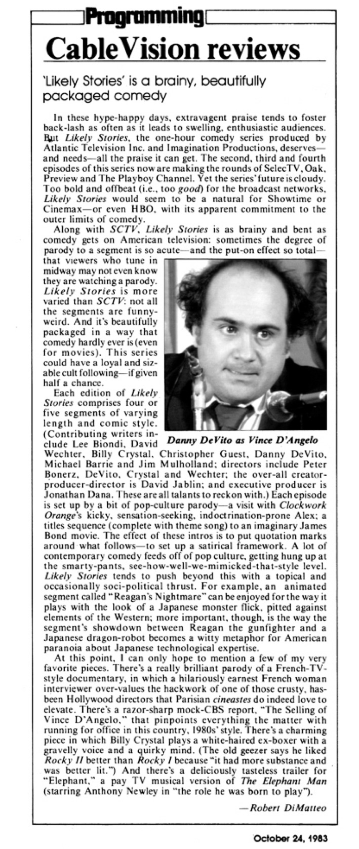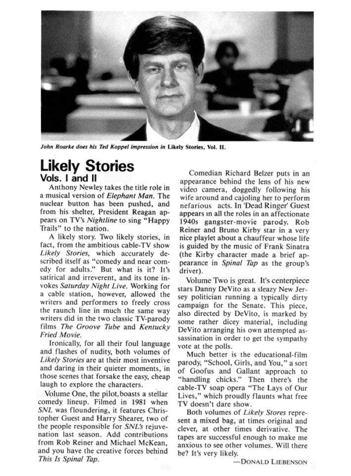“Likely Stories” was one of Pay-TV’s first original comedy series. Premiering in 1982 on HBO/Cinemax, each one hour show was a mixed-bag of short stories, political satire, outrageous parodies, and bold animation that helped define the cutting-edge for pay-cable comedy.